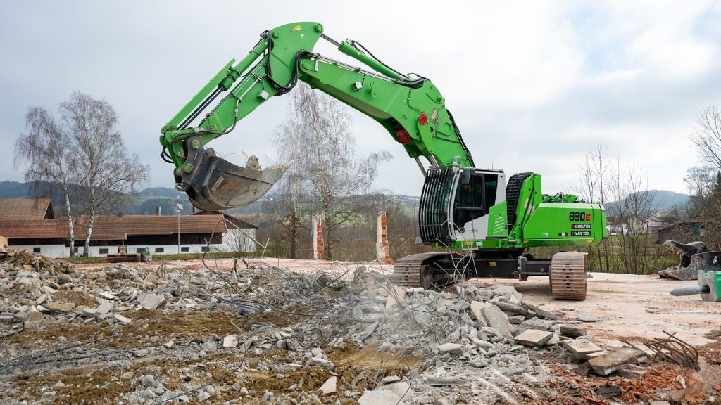After a building has been demolished, the debris must be disposed of and the site often has to be levelled or a new excavation pit has to be created afterward. The new digging boom of the SENNEBOGEN 830 E Demolition Vario Tool, the EA12 with a reach of 12 metres, has a three-part boom, which enables impressive lifting capacities of up to 6 tonnes and can therefore also operate heavy demolition tools of larger machine classes.